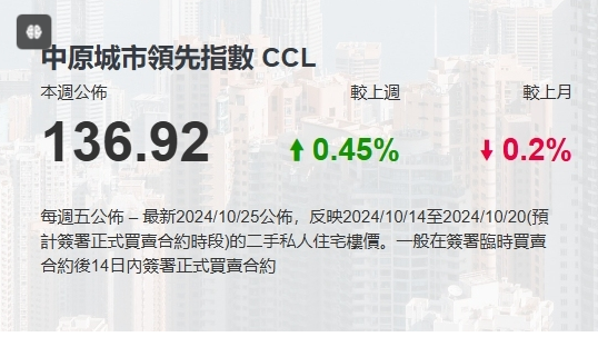 中原认为,9月减息后,楼市气氛好转,加上内地利好政策及新盘低开热卖,进一步提振市场信心,CCL连升3个星期,是今年3月以来首次,相信短期楼价回稳。
