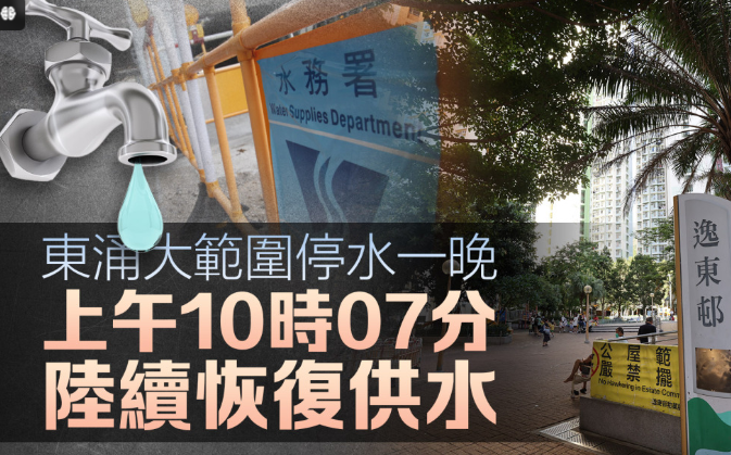 大屿山翔东路近小蚝湾滤水厂对开发生爆水管事故,东涌一带食水供应昨晚(3日)10时起,一度暂停供水12小时,约12万人受影响。 水务署原先计划早上6时恢复供水,其后数度宣布延迟,直至今日(4日)上午10时许方恢复供水。