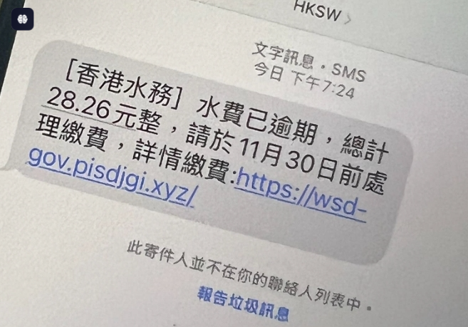 近日,有市民在网上讨论区表示,收到一则声称来自水务署的短讯内容,其内容以“香港水务”开头,并要求市民缴交总计28.26元的逾期欠款,并附上怀疑伪冒网站的连结:https://wsd-gov.pdgol.sbs。