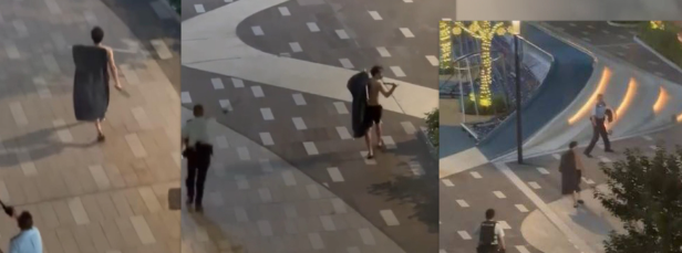 网上fb群组有视频显示,一名上身赤裸身穿短裤的中年男子,右手持菜刀,右肩摃上一支晾衫竹,竹上繫有一块大黑布状似黑色的旗帜,一边挥动一边以菜刀乱舞,往西铁元朗站方向游荡。两名警员紧随该名男子,其中一警手持盾牌与警棍追赶,其后该名持盾牌警员一度越过该名男子,喝令对方停下但他未有理会,3人展开追逐,男子一直狂奔逃跑。