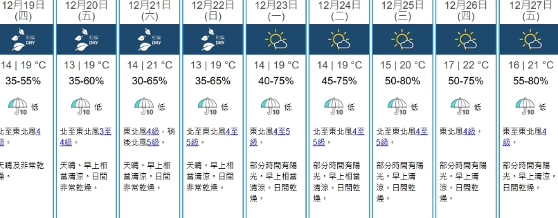 九天天气预报显示,天文台料周五(20日)市区清晨气温降至摄氏13度。周六(21日)冬至天气清凉,最低维持14度。至于下周二平安夜(24日)及圣诞节,早上仍清凉,气温则回升至15至20度。