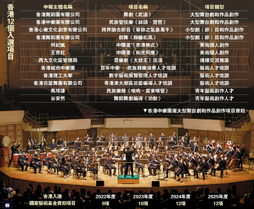 国家艺术基金管理中心近日公示国家艺术基金(一般项目)2025年度资助项目名单,其中香港特区有12个项目入选,包括大型舞台剧和作品创作项目2项、小型剧(节)目和作品创作项目2项、美术个人创作项目2项、传播交流推广项目1项、艺术人才培训项目3项、青年艺术创作人才项目2项。