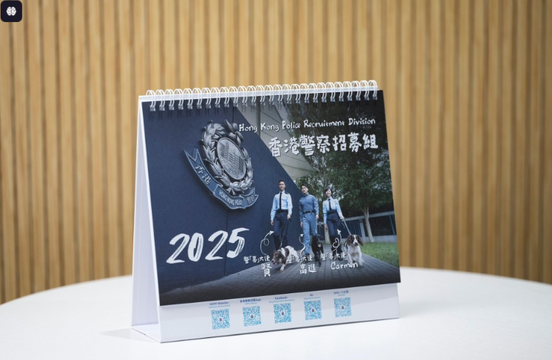 此外,因应新年到来,警察招募组首次推出特制非卖品年曆,与警犬队合作,由警“募”大使与“毛”敌拍档携手打造2025年曆,并会免费送赠给在本周六及日“警察·社区招募快线”,即场投考或参与警队学长计划的市民。