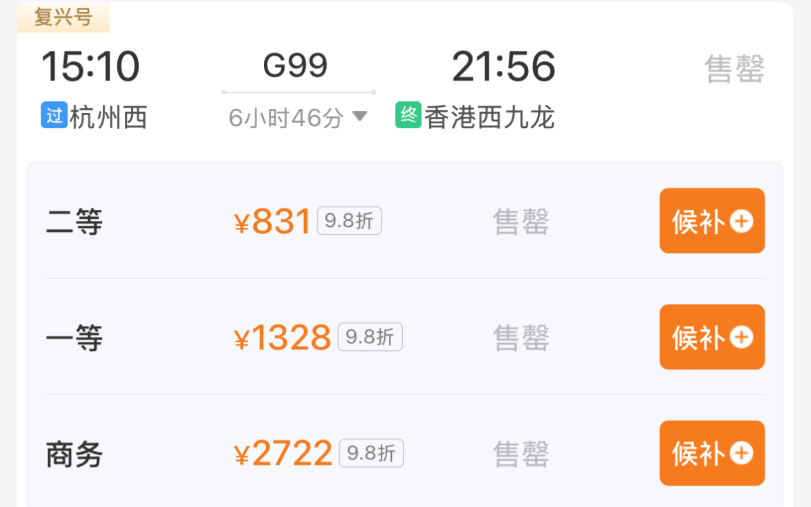 据12306资料显示,可以看到G99次列车每日下午3时10分从杭州西站出发经过黄山北站、南昌东站等站后,于21时56分抵达香港西九龙站,全程耗时6小时46分钟。此外,G100次列车每日11时37分从香港西九龙站出发,经过深圳北站、惠州北站等站后,于18时27分抵达杭州西站,全程耗时6小时50分钟。