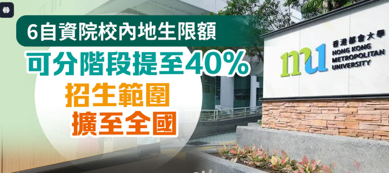 教育局今日(26日)宣布,已取得国家教育部同意,逐步放宽已获批准招收内地学生入学位课程的六所自资院校的内地学生限额,以及批准有关院校面向全国所有省(区、市)招生,以进一步支持自资专上教育界别的健康稳健发展,对建设香港成为国际专上教育枢纽作出更积极贡献。 该六所院校分别是香港都会大学、香港树仁大学、香港恒生大学、香港珠海学院、东华学院,以及职业训练局辖下的香港高等教育科技学院。