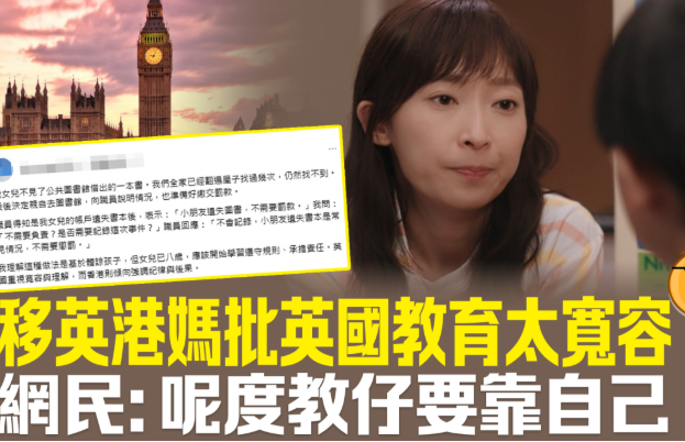 好多港人都话移民英国系为咗「下一代」,惟近期有移英港妈对英国教育甚为不满。 话说她8岁的女儿不见了公共图书馆借出的一本书,然而职员得知后,表示「小朋友遗失图书,不需要罚款。」港妈批评,馆方处理手法太过宽容,指应该从小教育遵守规则、承担责任。