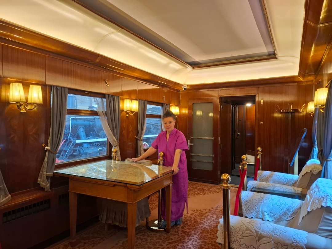 这辆公务车有着特殊的历史地位,它是毛泽东主席在1950年至1975年间使用的公务车,还曾被称为“流动的中南海”。其由原民主德国在20世纪50年代制造,车辆全长达到24.5米,车内设施完备,设有主席的主卧室、副卧室、卫浴室,还有警卫、秘书、乘务人员用房和设备间。其中约20平方米的会议室十分引人注目,内部有沙发、桌椅和欧式床榻。在那个年代,毛主席乘坐火车外出视察时,多在此处接见沿途省、市的党政军领导,并召开重要会议。