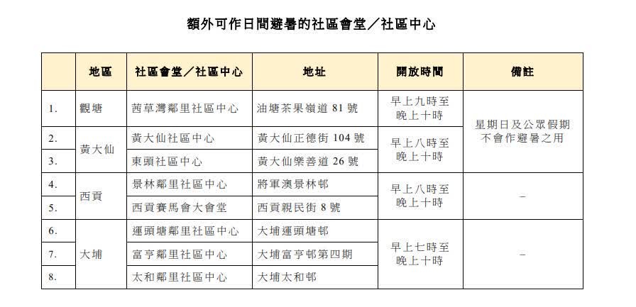 除以上臨時避暑中心外,部分社區會堂和社區中心亦會於開放時間內供市民作日間避暑之用,詳細地址見下表: