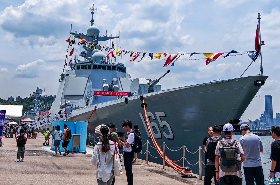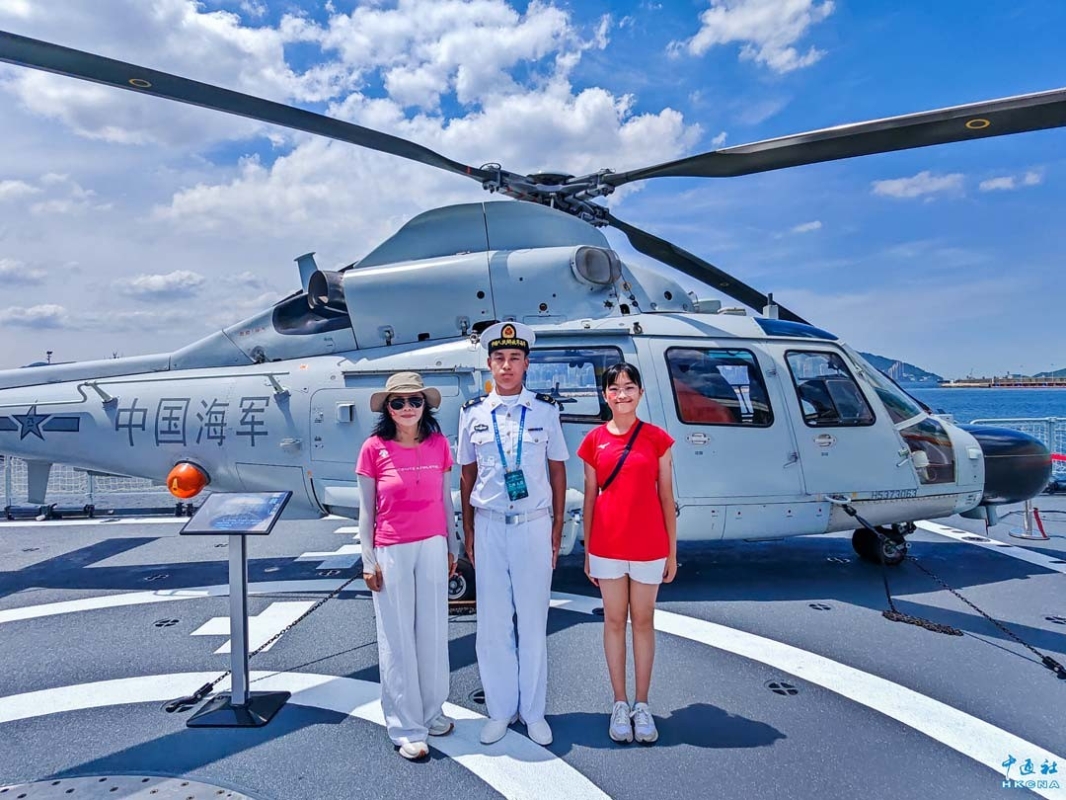 7月6日,香港市民在昂船洲海軍基地參觀湛江艦。7月5日至6日,山東艦在西面2號錨地面向香港市民開放,派票2000張;湛江艦、運城艦在昂船洲軍港開放,派票8000張。 香港中通社圖片