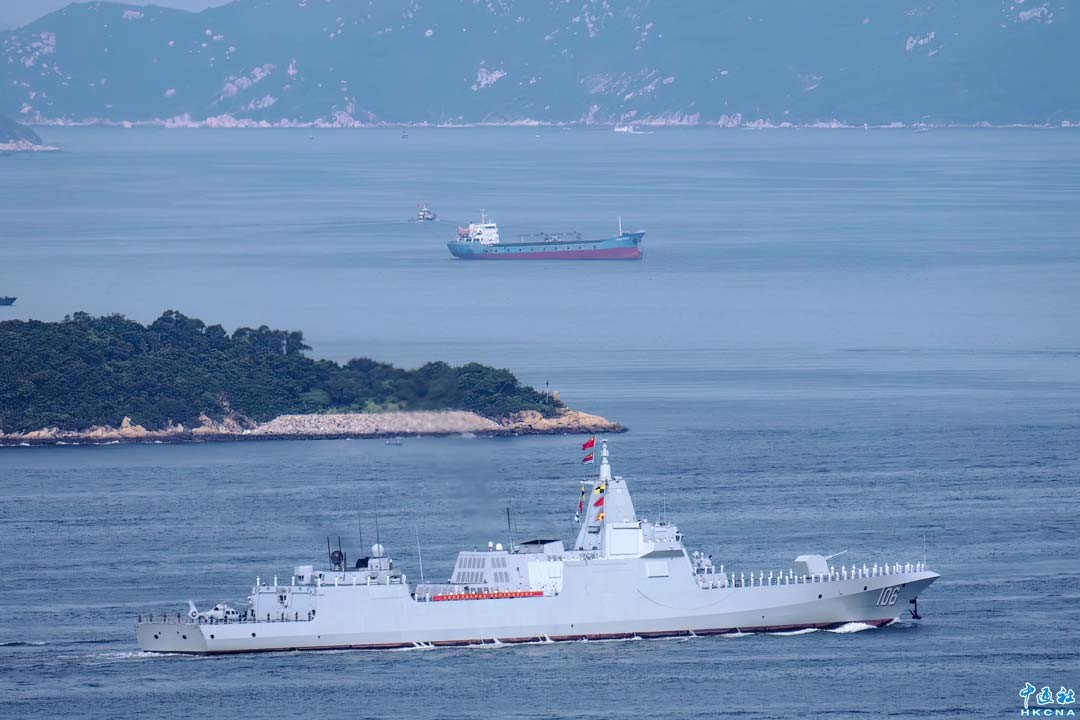 7月3日上午,山東艦航母編隊抵達香港。圖為萬噸大驅”延安艦”(舷號106)進入香港水域。(蔡志東 攝)