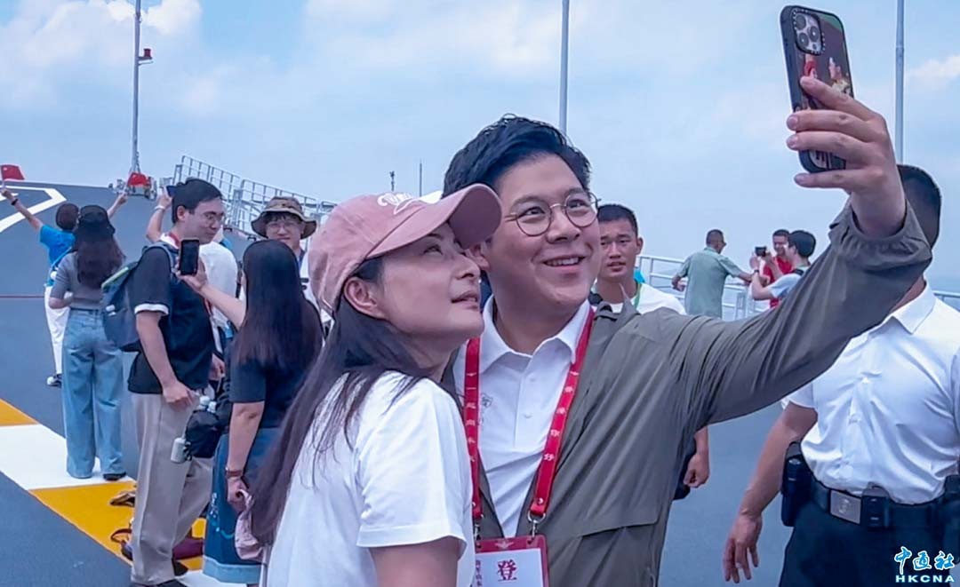 7月6日,香港立法會議員霍啟剛和奧運冠軍郭晶晶在山東艦甲板留影。(付鈺 攝)