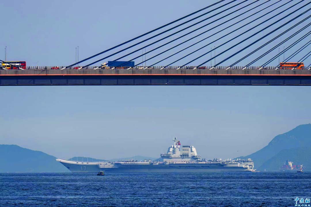 7月6日,山東艦航母与香港汲水門大橋相輝映。(蔡志東 攝)