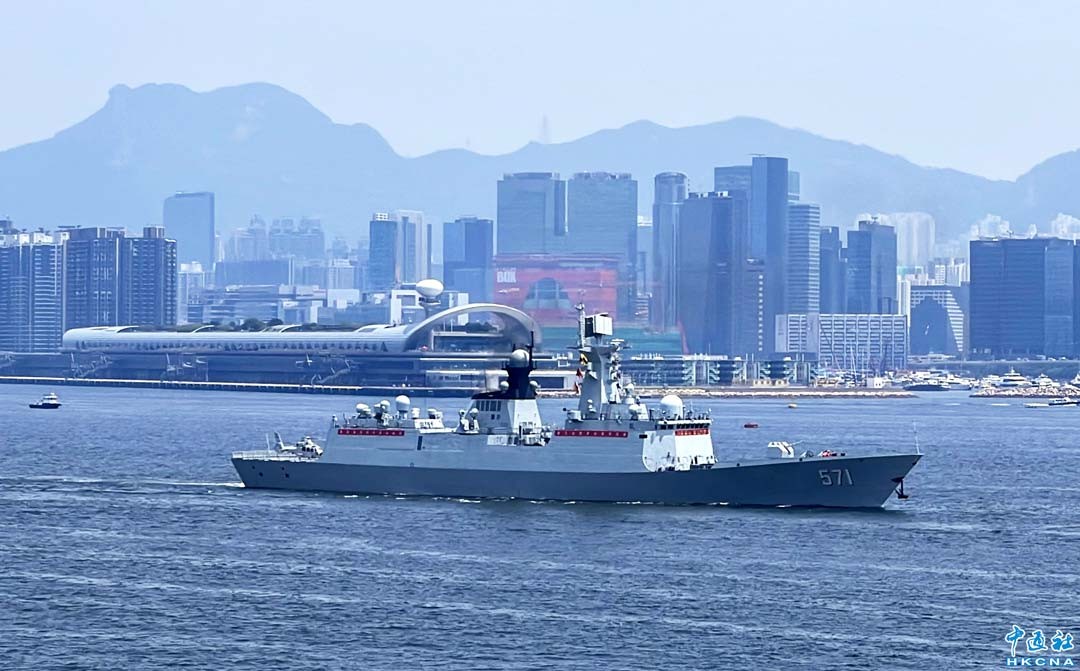 7月7日,山東艦航母編隊結束訪問行程,離開香港。圖為“湛江”號導彈驅逐艦。(殷田靜子 攝)