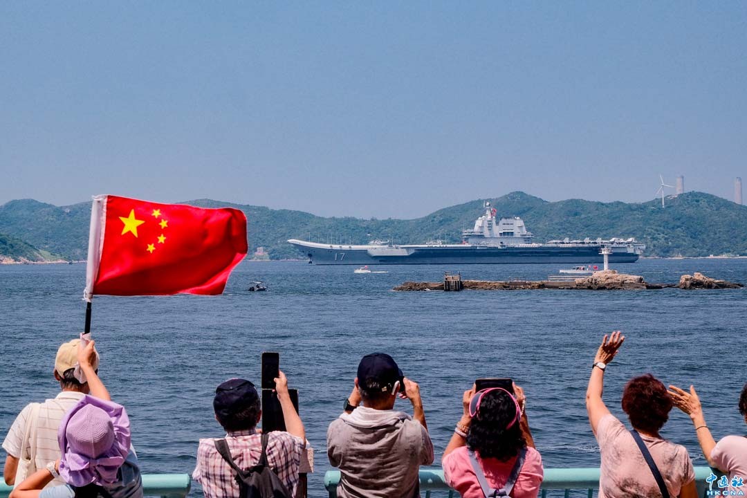 7月6日,山東艦航母編隊结束訪問香港行程,市民站在玉桂山山頂揮舞國旗送别,山東艦鳴笛回應。(蔡志東 攝)