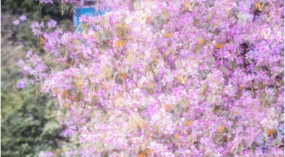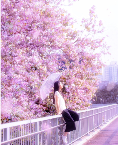 对于这种怎么拍怎么美的花树,考验的就是如何拍得更加专业和特别,所以我带了70-200mm的长焦镜头,压缩空间,让画面显得宏大。花树旁刚好有一个升降梯,可以站在升降梯门口用长焦拍过去,不仅能拍到更多的花朵,也能挡住其他不需要的道路。