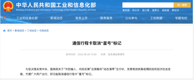 为坚决落实党中央、国务院关于“外防输入、内防反弹”总策略和“动态清零”总方针,支撑高效统筹疫情防控和经济社会发展,方便广大用户出行,即日起取消通信行程卡“星号”标记。