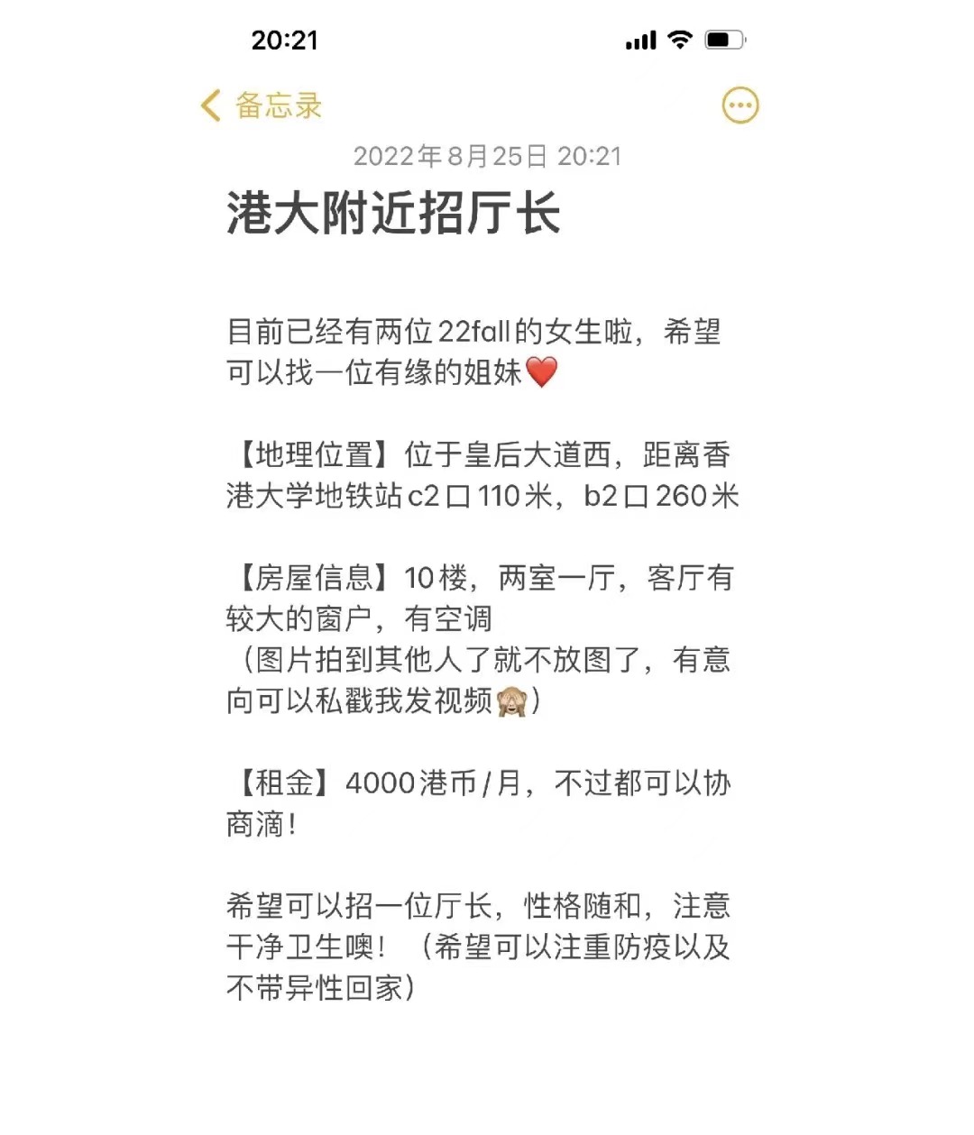 港大附近两室一厅的房源,想找一位厅长姐妹
