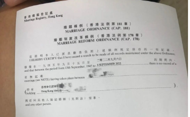 1(圖一)必須現在香港婚姻登記處拿一張無結婚證明,可以親自去任何一間婚姻登記處拿(我是去到現場20分鐘左右拿到)或者網上申請,但需要的時間比較長,10個工作天後也要親自去婚姻登記處拿(所以本人覺得沒必要網上申請,直接現場去馬上拿更方便快捷)