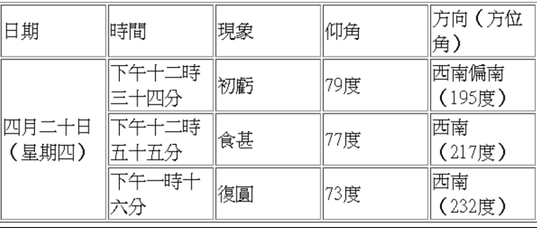 香港天文台表示,4月20日(星期四)在香港将出现日偏食。是次日食在下午12时34分开始,至下午1时16分结束,食甚时间为下午12时55分。是次日偏食的食分只有0.028,即是在食甚时,太阳只有2.8%的直径会受月球阻挡。是次日偏食的详情见下表: