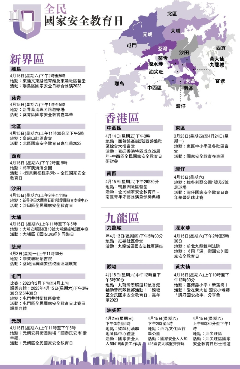 今年4月15日“全民国家安全教育日”的活动将包括纪律部队综合升旗礼、纪律部队开放日、纪律部队国家安全杯颁奖、“全民国家安全教育日”开幕典礼、专题讲座、学校工作坊、社区巡回展览等。同时全港18区也会举行活动,共同响应“全民国家安全教育日”。