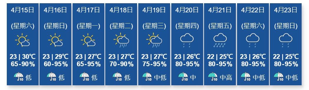 天文台预测,本港今日(15日)部分时间有阳光,能见度较低。天气炎热,最高气温约30度。稍后有一两阵骤雨。吹轻微至和缓偏北风。明日大致天晴,日间天气炎热。下周初部分时间有阳光,亦有几阵骤雨。下周中至后期天气渐转不稳定。