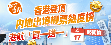 剧媒体报道,内地“五一”黄金周临近,不少民众开始计划旅行,境内航班搜索热度已超过2019年150%,跨境航班搜索热度较2019年同期增近40%。当中,香港是出境机票热度Top 1目的地。香港航空今日(17日)起在携程平台推出“买一送一”活动,旅客以单人机票的价格,即可享受双人机票福利。