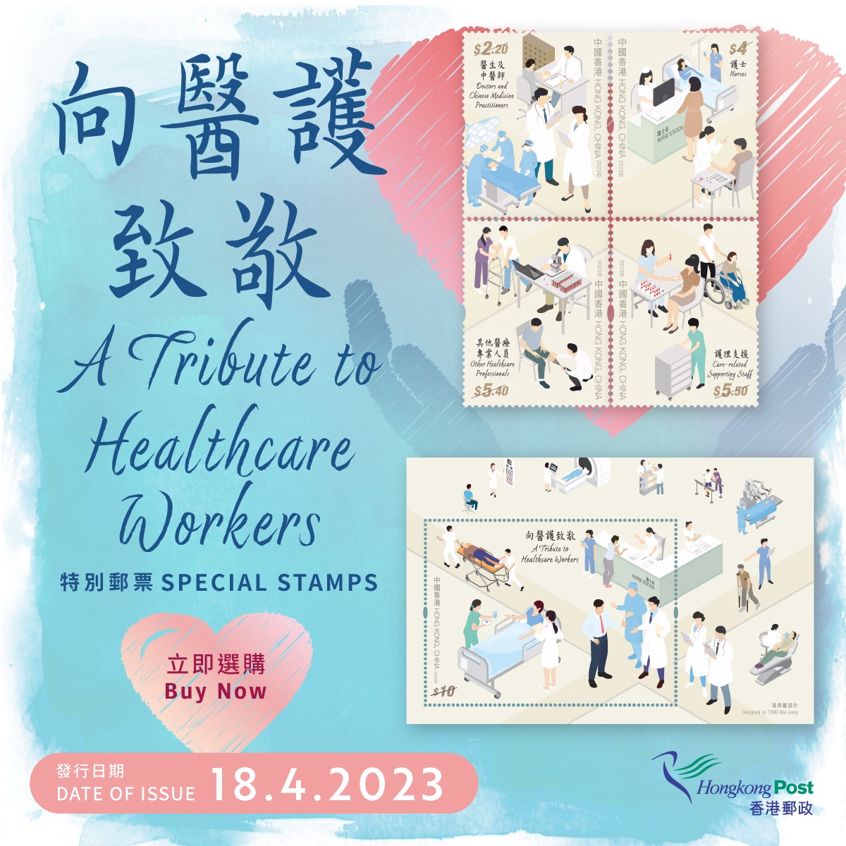 香港邮政今日(18日)以「向医护致敬」为题发行特别邮票,向在疫情爆发时一直紧守岗位的医护人员致以崇高的敬意。