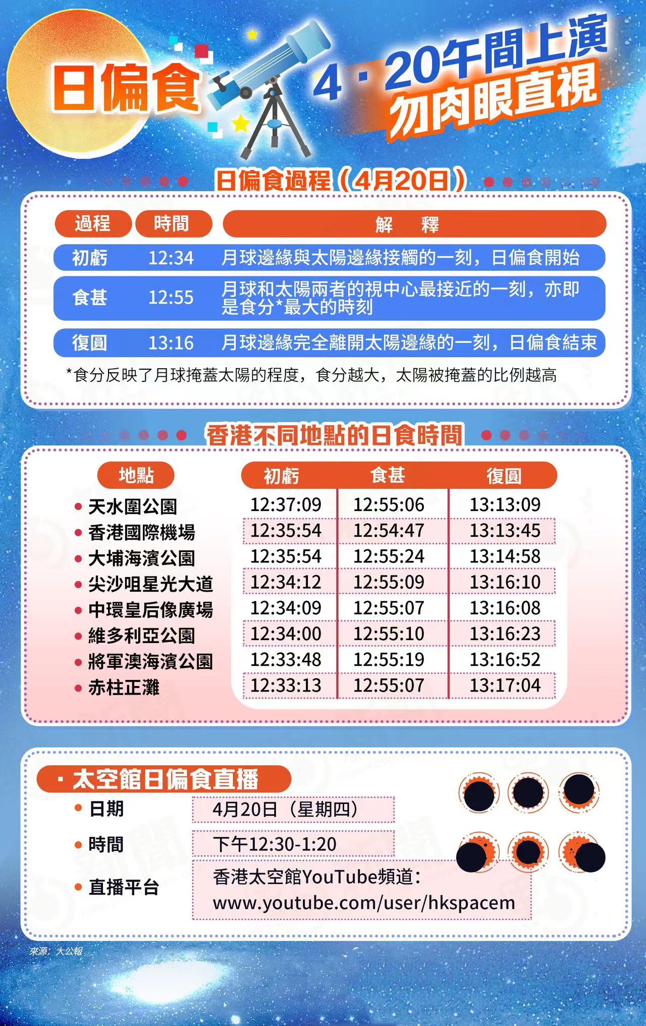 是次日食原为「全环食」,由于中心点位于赤道以南,愈靠近中心点,日食食分亦会愈大,故只有部分地区可见到日全食或日环食,全港多区都可观测到。太空馆提醒,在本港东南部的日食幅度较大,日食时间亦较长,建议有意观测的市民优先考虑前往九龙东或港岛东等地区,包括石澳泳滩、赤柱正滩及小西湾海滨花园等观看。香港太空馆将直播日偏食发生时的太阳影像,市民可通过香港太空馆的网上频道欣赏日食的即时影像。