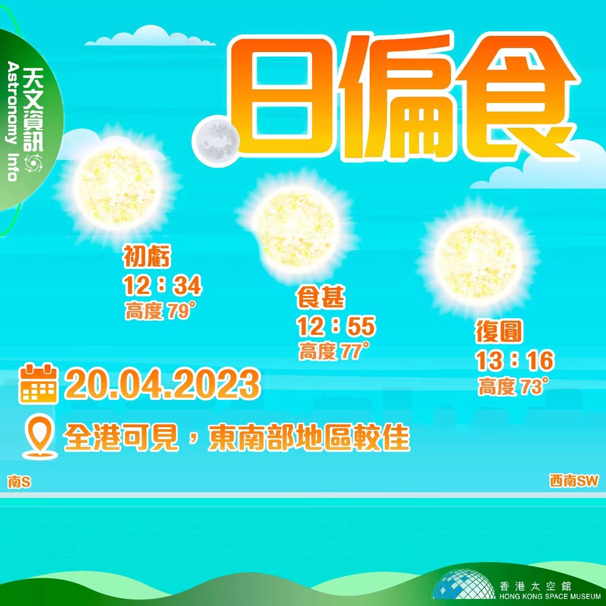 天文爱好者请留意,今日(20日)本港将上演罕见天文异象「日偏食」!今日的日偏食将在下午12时34分开始,下午1时16分结束。食甚时间为下午12时55分,全港多区都可以观测得到,若天气情况许可,大部分面向西南方而没有障碍物的地方均适合观赏。
