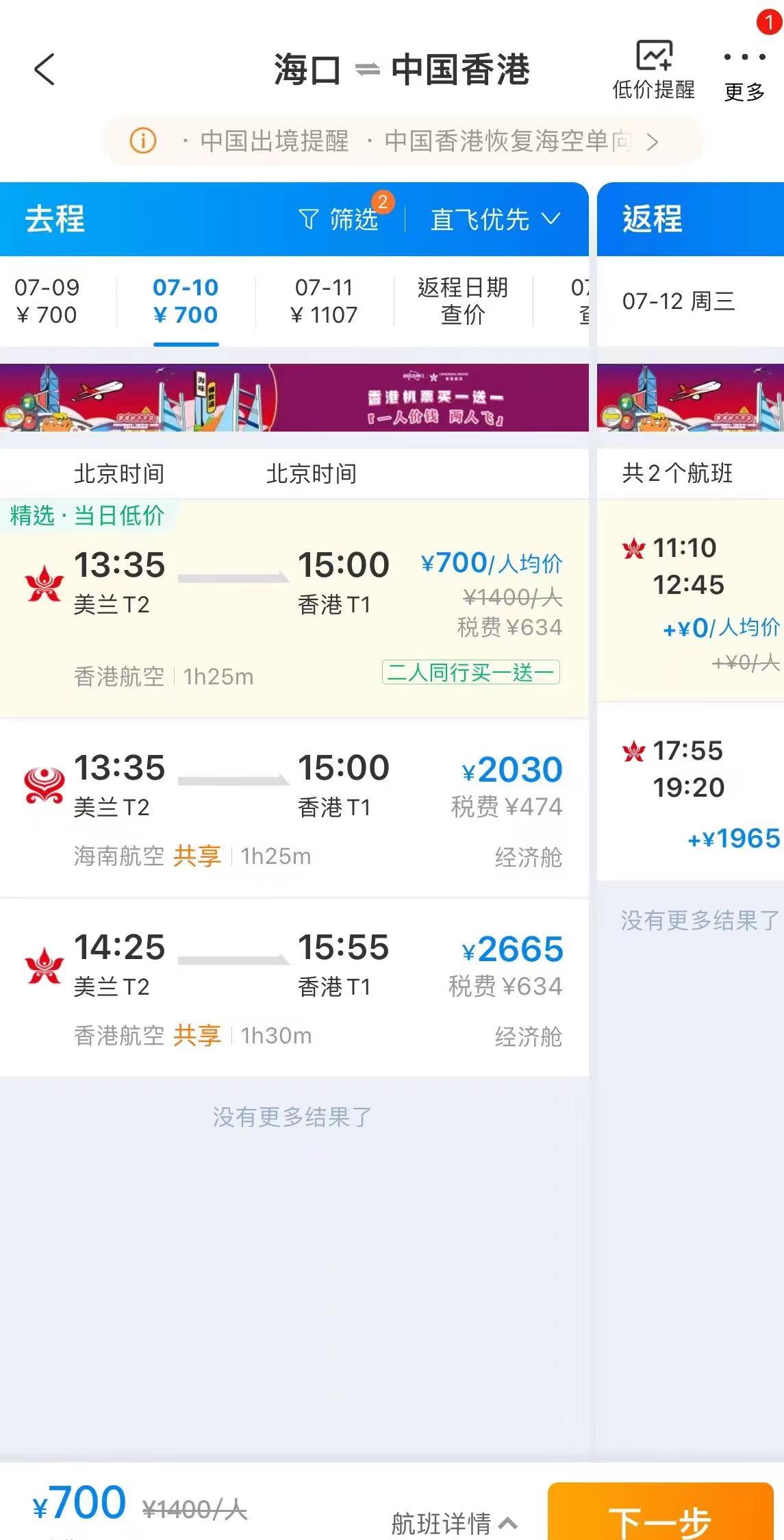 值得留意的是,“二人同行买一送一”活动页面显示的价格为折后人均价,并非两人价格。例如海口往返香港的航班,人均机票价格700元、税费634元,选择两位乘机人后,旅客实际需要支付的总价为2668元。
