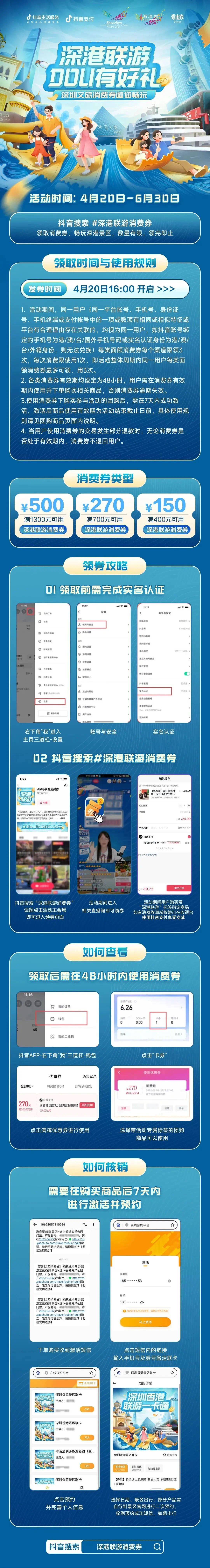 4月20日至6月30日期间,深圳市文化广电旅游体育局发放500万消费券定向补贴联游套票和联游线路,提供“深圳景区n选1+香港景点”组合。活动已于4月20日在抖音活动主会场正式上线,市民游客可打开抖音搜索“深港联游消费券”,点击进入主会场,即可领取3种面额消费券:“满400减150”“满700减270”“满1300减500”,分别用于深港联游套票和联游线路产品购买,每次限用1张,每种面额可以最多用3张。