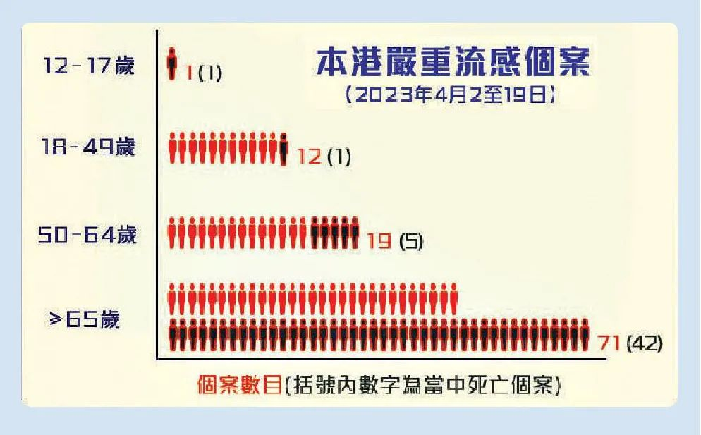 政府社交平台表示,本月2日至19日期间,共录得103宗经化验确诊流感并需深切治疗或死亡个案,当中49人死亡,并包括1宗儿童死亡个案。 卫生防护中心最近一期的新冠病毒及流感速递数据显示,在第15周(4月9日至15日)所收集样本中,流感病毒阳性百分比达到15.81%,高于9.21%的基线水平,并高于前一周录得的14.41%,当中83%为甲型(H1)流感、17%为甲型(H3)流感。