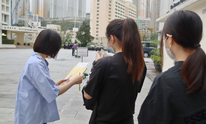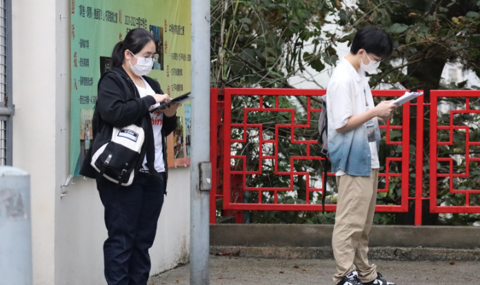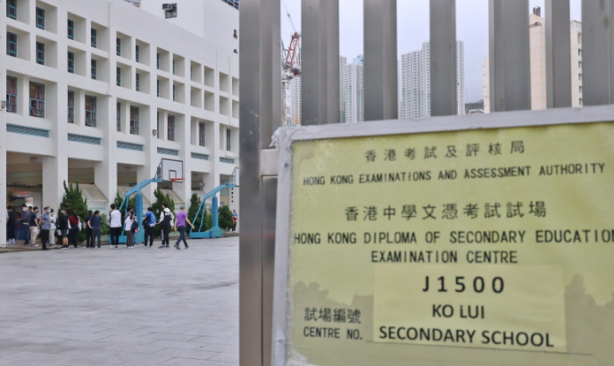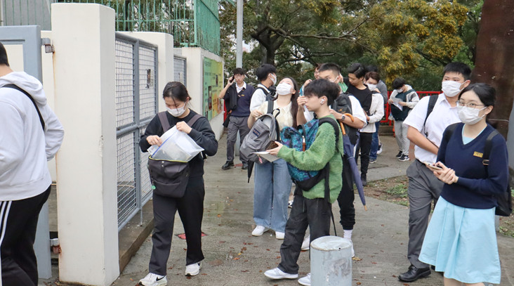 在观塘的高雷中学早上7时已有应届考生在试场门口等候,校方于上午7时45分开始安排考生核实身份后进入学校,之后学生排队量度体温,递交健康申报表及登记才可进入考场。