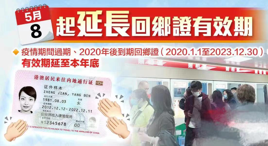中华人民共和国出入境管理局28日发布公告,为依法保障港澳居民来往内地权益,自5月8日起,对有效期限截止日期为2020年1月1日至2023年12月30日的港澳居民来往内地通行证(俗称“回乡证”),证件有效期限统一延长至2023年12月31日。