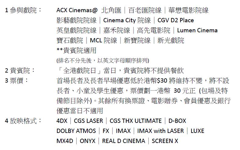 政府启动以市民为对象的「开心香港」(Happy Hong Kong)活动,提供美食体验、游乐和文青创作等活动,刺激本地消费和经济。 「开心香港」系列活动之一的「全港戏院日」今日(29日)举行,戏票划一盛惠30元。 市民可以30元优惠价,到全港任何戏院,欣赏上映中任何放映格式的电影。