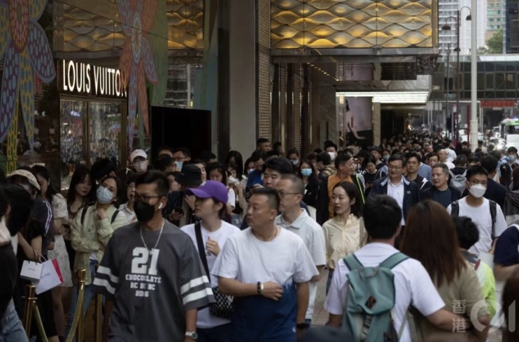香港在五一黄金周也迎来了大量内地游客。香港热门的景点和商圈都是人满为患。香港是购物者的天堂,在尖沙咀广东道的奢侈品店门口,聚集了前来购物的游客。