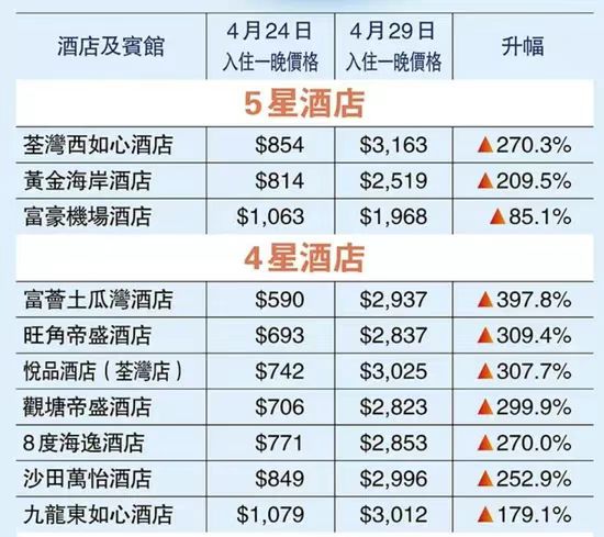 来香港给内地游客的第一印象就是高昂的酒店价格。酒店预订平台的数据显示,多区酒店房价上涨价格是原先的四倍,连重庆大厦内的“宾馆”价格也翻了翻。