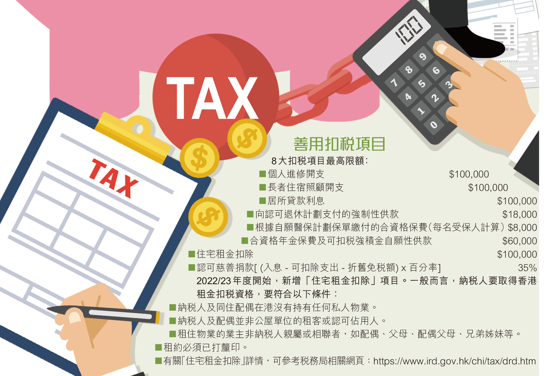 今年立法会亦已通过最新《财政预算案》的建议,增加2023/24年度薪俸税和个人入息课税下的子女基本免税额及子女出生课税年度的额外免税额,由120,000元增至130,000元。有关免税额项目,详见下表:(2022 / 23年度免税项目总览)