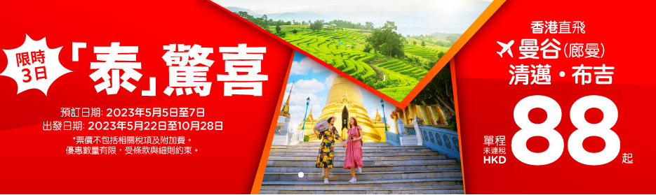 亚洲航空(AirAsia)今日(5日)起推出限时3日机票优惠,香港飞泰国曼谷(廊曼)、清迈、布吉单程88元起,来回连税曼谷/清迈905元、布吉995元起。