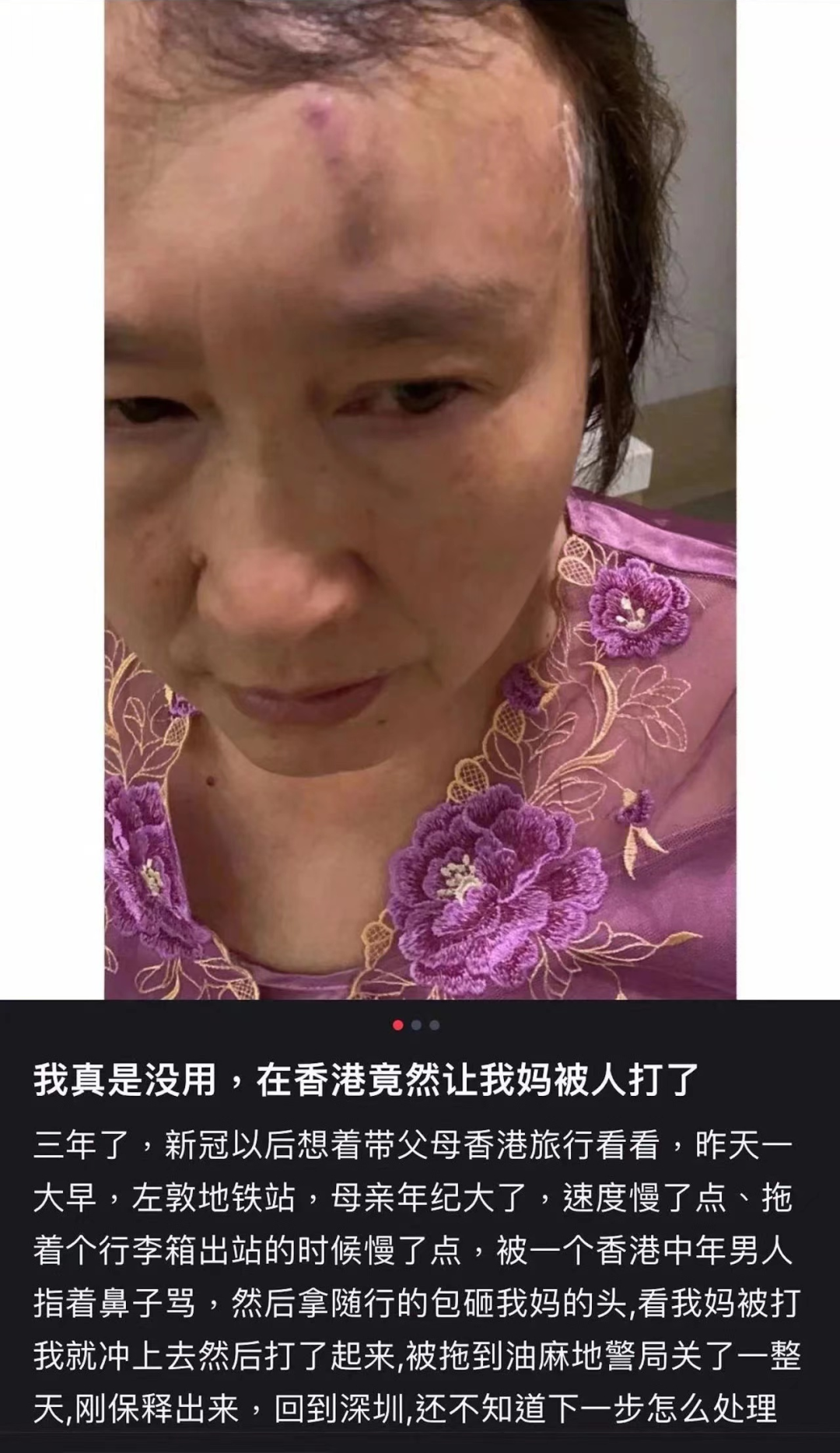帖文标题为《我真是没用,在香港竟然让我妈被人打了》,帖文中说到,疫情三年后想带父母香港旅游看看,没想到一大早在佐敦地铁站遇到这样的事,现在刚保释出来回到深圳,还不知道下一步怎么处理。