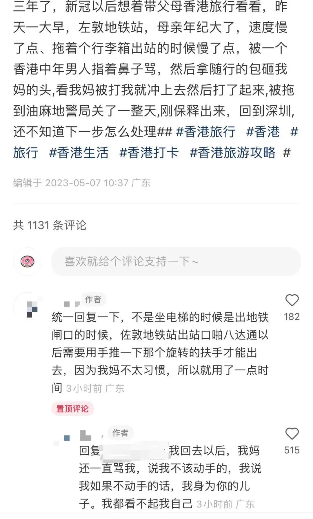 此帖文引发网民热议,事主回应网民:事发于出地铁闸门时,因佐敦站的闸机是旧式闸机,拍八达通卡后需要用手推旋转扶手才能出去,母亲年龄大、拖有行李箱,不太习惯旧式闸机,所以用了一点时间,未料被一名中年男人指着鼻子骂,对方还“拿随行的包砸我妈的头,看我妈被打我就冲上去然后打了起来”。后来被拘留在油麻地警署,现被保释,目前已返回深圳,“我回去以后,我妈还一直骂我,说我不该动手的,我说我如果不动手的话,我身为你的儿子。我都看不起我自己”。