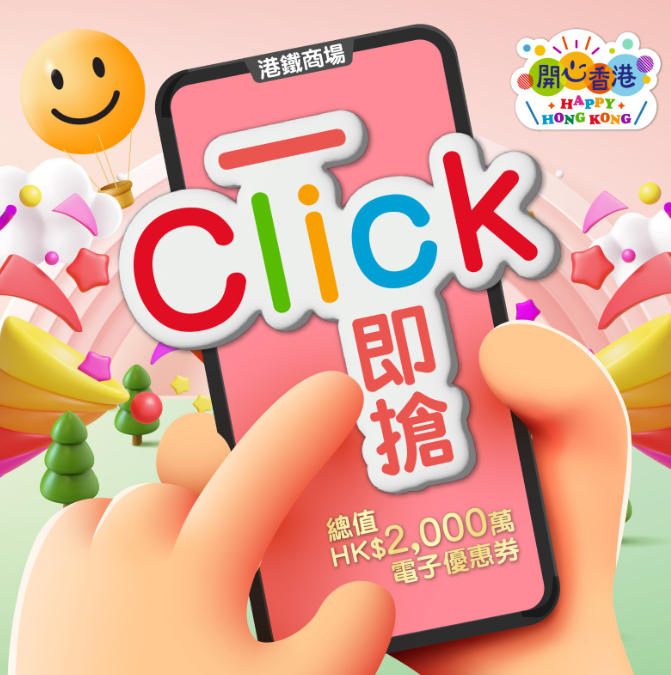 港铁支持“开心香港”活动,再度推出大型奖赏活动“一Click即抢”,今日(10日)起,连续3个星期三将派发共12万张港铁商场电子优惠券,总值2000万元,每人有机会获取最高1300元电子优惠券,先到先得。