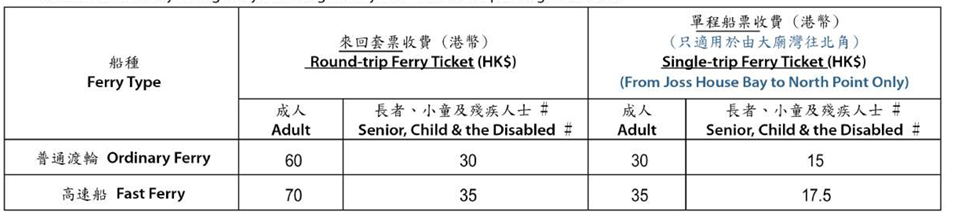 乘客可于上述两日在北角码头(只售来回套票)及西贡大庙湾(只售前往北角之单程票)购买船票。 乘客凭西贡大庙湾往北角的船票票据或八达通纪录,可于当天北角往红磡或北角往九龙城的渡轮服务时间内,免费乘搭北角往红磡或九龙城的渡轮服务一次。 相关乘客须使用已缴付西贡大庙湾往北角船费的八达通卡,于北角码头指定八达通闸机拍卡入闸,方可享用有关优惠。