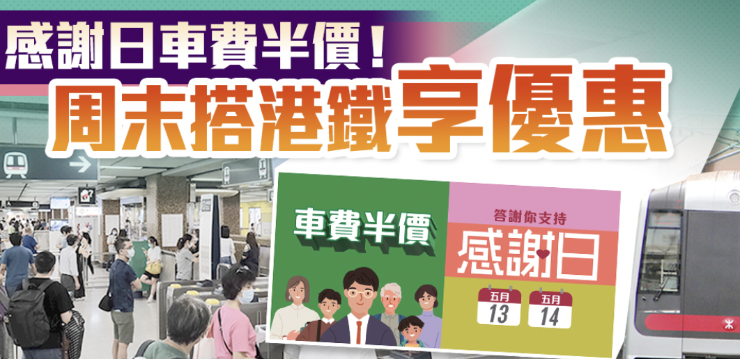 港铁早前公布,今明两天(5月13日及14日)继续推出“感谢日”半价乘车优惠,使用八达通乘搭港铁(包括来往罗湖及落马洲站的车程),每程付费车程即自动享有50%车费扣减,即乘搭港铁可享有半价优惠。轻铁及行走新界西北路綫的港铁巴士均提供此优惠。