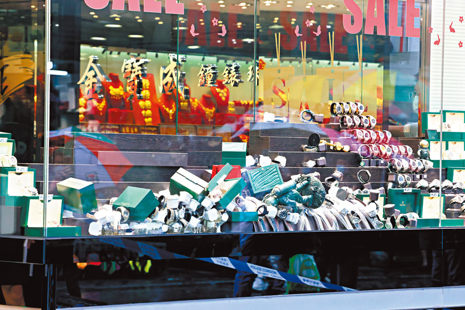 本港近月接连发生严重店铺劫案,继上周五(12日)有独行匪打劫观塘一间珠宝金行后,事隔仅两日,另一间位于屯门的钟表珠宝行,昨母亲节遭3名分别持刀和铁鎚的男匪徒闯入打劫,1分钟内掠去约120只名贵手表,包括劳力士,再登上附近一辆接应的私家车逃去。警方事后封锁现场调查,又在附近展开兜截,惜无发现。经点算,店舖损失名表总值约1,500万元,是今年至今涉及最大金额的店舖劫案,亦是近9个月内发生的第七宗严重店舖劫案,合共涉及钟錶等财物总值逾6,000万元。