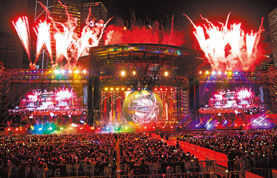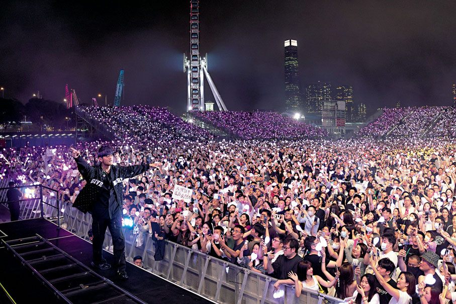 周杰伦与中环海滨近4万人合唱《听妈妈的话》。