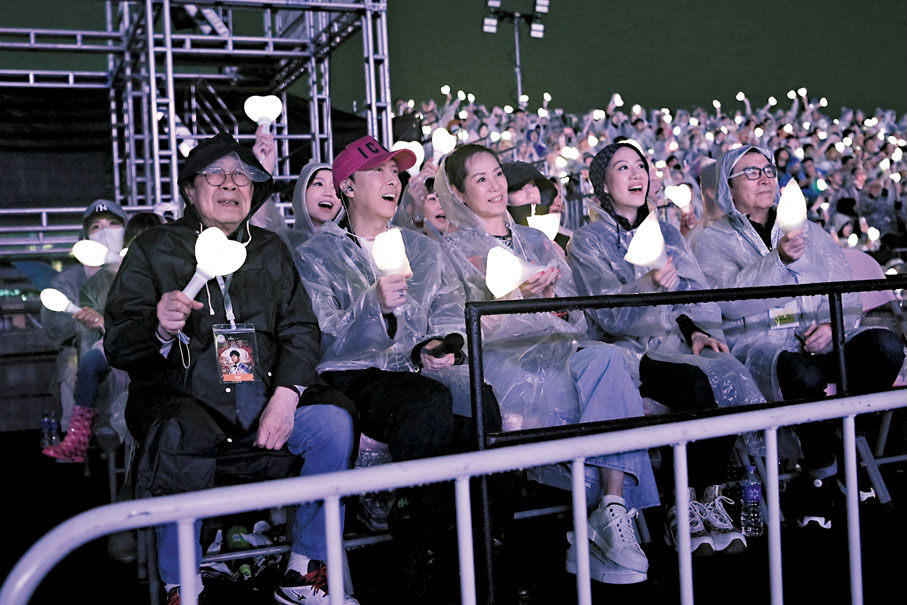 (香港文汇报 记者 子棠)周杰伦(周董)在中环户外举行的7场《嘉年华世界巡迴演唱会2023香港站》于前晚母亲节完成最后一场,尾场更特别唱出《听妈妈的话》,引中环海滨近4万人大合唱,歌声响彻维港。尾场亦吸引不少圈中人冒雨睇骚,包括91岁的胡枫(修哥)、甄子丹和汪诗诗夫妇、姜大伟、李琳琳、霍启刚和太太郭晶晶、吴若希、戴祖仪、周家蔚、姚子羚、胡鸿钧等,胡枫更和甄子丹一起点唱《千里之外》,表现兴奋。