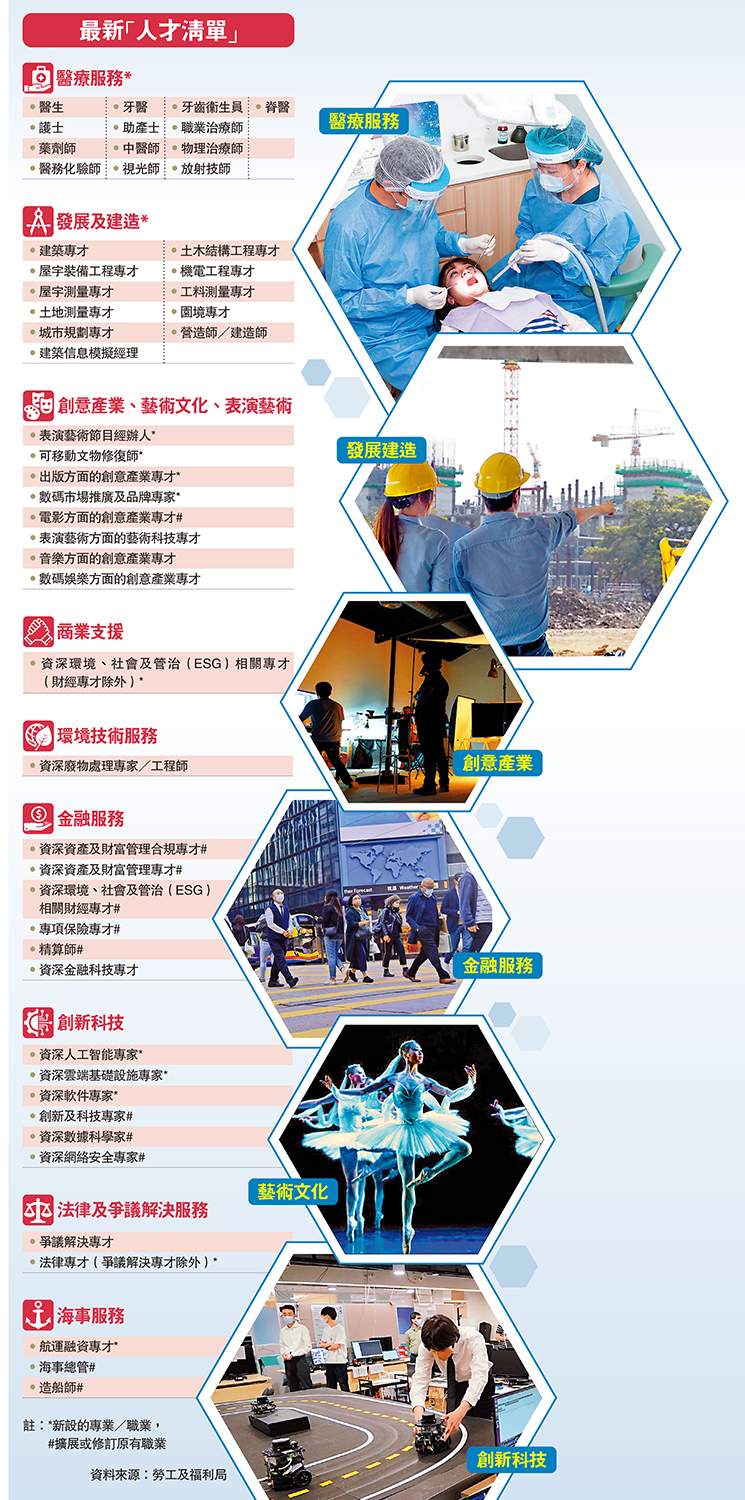 本港为推进高质量发展,加速引进人才。政府昨日公布,将「人才清单」扩大至9个行业合共51项专业,当中24项为发展及建造、医疗服务行业,包括建筑专才、西医、中医师、牙医、物理治疗师等专业;在创意产业及文化方面亦将文物修復师、电影男女主配角等纳入清单,着力促进中外文化艺术发展交流。