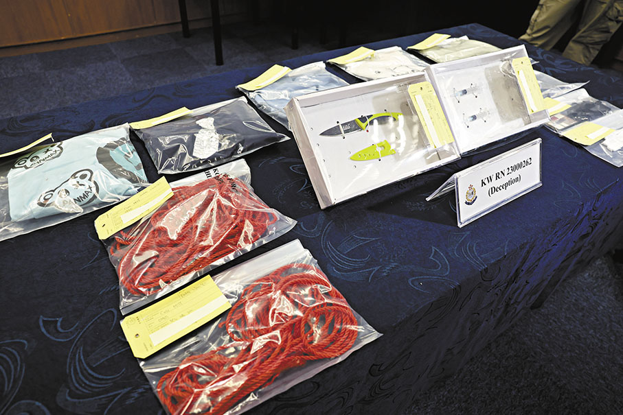 警方展示证物中,包括利刀、针筒及绳索等。