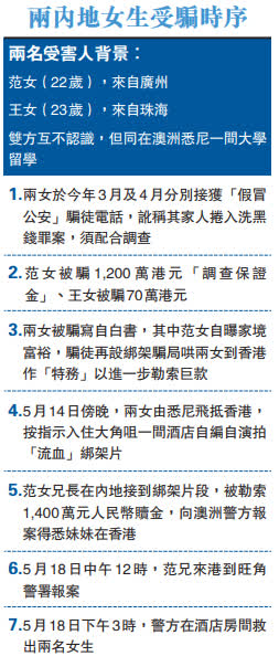 本月14日黄昏,两女由澳洲乘航班抵达香港,并租住大角咀一间酒店。骗徒称为守秘密,要求两人通过短讯报告行踪。为求影片逼真,骗徒要求王女用刀割伤范女臂见血,其后将片段传给范女家人,勒索1,400万元人民币赎金。